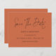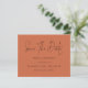 Budget Minimalist Script Terracotta QR Code Save The Date. A budget price SMALLER 4.5” x 5.6” alternative. Available in a SEMI-GLOSS 110 lb CARD STOCK which is the default option (thicker for invitations), OR a SATIN FINISH 80 lb THINNER PAPER STOCK (ideal for enclosures). Add your QR code to your wedding website on the back. Simple elegance with Save The Date in a modern set script.The rest of the text you can easily personalize.Shown here in black on terracotta however the text and background colors can be changed if you wish via the customize further option.