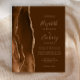 The left-hand edge of this elegant modern wedding invitation features a mocha brown watercolor agate border trimmed with faux gold glitter. The customizable text combines gold-colored handwriting, copperplate and italic fonts on a brown background. The reverse side features a matching mocha brown and gold agate design.