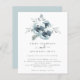 Modern Christmas Floral Bouquet Wedding Invitation. A budget price SMALLER 4.5” x 5.6” alternative. Available in a SEMI-GLOSS 110 lb CARD STOCK which is the default option (thicker for invitations), OR a SATIN FINISH 80 lb THINNER PAPER STOCK (ideal for enclosures). Envelopes are an optional extra and are slightly larger than the card size. A Christmassy teal and powder blue florals and foliage bouquet is above the elegant text centered below. Easily personalise the text to your own details.