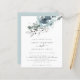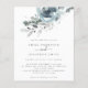 Modern Christmas Florals Wedding Invitation. A budget price SMALLER 4.5” x 5.6” alternative. Available in a SEMI-GLOSS 110 lb CARD STOCK which is the default option (thicker for invitations), OR a SATIN FINISH 80 lb THINNER PAPER STOCK (ideal for enclosures). Envelopes are an optional extra and are slightly larger than the card size. Christmassy teal and powder blue florals and foliage flow from the top and elegant text centered below. Easily personalise the text to your own details.