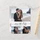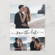 Modern Chic Sophisticated Calligraphy Collage Wedding Save The Date Postcard, a perfect blend of contemporary style and timeless charm. Immerse yourself in the allure of a striking 3-grid photo collage seamlessly woven with elegant hand-lettered calligraphy. Crafted specifically for modern weddings, the reverse side facilitates seamless customization, featuring a full photo adorned with a delicate translucent overlay for effortlessly adding your wedding specifics. Personalize this card effortlessly with your cherished photos and wedding details, ensuring a unique and unforgettable announcement for your special celebration.