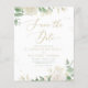 An elegant floral wedding Save the date card featuring white watercolor peonies and roses with greenery and modern delicate handwritten calligraphy.