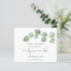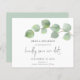 Modern Eucalyptus Script Save The Date. A budget price SMALLER 4.5” x 5.6” alternative. Available in a SEMI-GLOSS 110 lb CARD STOCK which is the default option (thicker for invitations), OR a SATIN FINISH 80 lb THINNER PAPER STOCK (ideal for enclosures). Envelopes are an optional extra and are slightly larger than the card size. A minimalist foliage design to invite your guests to save your date. Kindly Save Our Date is in a modern set script.The rest of the text you can easily personalise. Text and background colors can be changed if you wish via the customise further option.