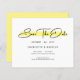 Budget Modern Minimalist Script Save The Date Invitation Card features "Save The Date" in an elegant black script over a modern yellow accent on a white background with your Save The Date information below. Personalize by editing the text in the text boxes provided. Designed for you by ©Evco Studio www.zazzle.com/store/evcostudio