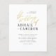A modern & rustic photo wedding invitation. At the top of the page, the invitation reads "kindly join us to celebrate" followed by "the wedding of" in faux gold foil calligraphy. The couple's names appear below, aligned to the left. There is a gold horizontal line divider separating the names from the event details. The date appears in bold capitals with the time in italic serif typography. The venue appears in handwritten script lettering, the address in bold capitals, and the reception info in italic serif typography again. The typography is centered in the middle of the card with a clean white background. These cards reverse to the engagement photo of your choice. If you don't want to showcase a photo, simply delete the template image and choose one of your wedding colors instead for a simple theme. You might want to change the positioning, fonts, colors, or photo layout, simply choose "Personalize" and then "Edit using the design tool" to access Zazzle's intuitive design tool. Note that "the wedding of" is an image that cannot be modified with the design options. If you want it in a different color, don't hesitate to send me a message through the button below! Please remember to change or delete all of our template wording and photo. As part of the budget selection on Zazzle, this sheet isn't a standard invite size or paper quality. If you want this design on an invitation card you can find it in our store or use the Zazzle Make Machine to transfer it onto the product of your choice. We hope you will enjoy personalizing this chic design to create your own truly unique wedding invitations. If you need a hand with anything, I'll be happy to help. Just note that I can't edit an order once it has been purchased, contact me before buying! We have other similar designs in our store, so please have a look if you would like to browse more invites!