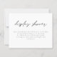 Budget Modern Script Display Bridal Shower Encl. A budget price SMALLER 4.5” x 5.6” alternative. Available in a SEMI-GLOSS 110 lb CARD STOCK which is the default option (thicker for invitations), OR a SATIN FINISH 80 lb THINNER PAPER STOCK (ideal for enclosures). Envelopes are an optional extra and are slightly larger than the card size. Simple black and white elegance, with Display Shower in a set handwriting style script. Easily personalise the rest of the text to your own details. You can also change the text and background colors via the customise further option if you wish.