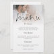 Budget Modern Script Photo Wedding Menu. A LARGER size 5.5” x 8.5” at a budget price, An elegant design with your photo to the top edge behind a graduated tint layer with the text partially overlaid on top of yorur image at the bottom. The main header is in a stylish set script and the rest of the text you can easily personalise.
