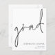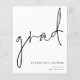 A budget price SMALLER 4.5” x 5.6” alternative. Available in a SEMI-GLOSS 110 lb CARD STOCK which is the default option (thicker for invitations), OR a SATIN FINISH 80 lb THINNER PAPER STOCK (ideal for enclosures). Envelopes are an optional extra and are slightly larger than the card size. This simple monochrome design to announce the news of your graduate has informal set handwriting style script for the main header, grad, and easy to personalise typography to the bottom right hand side with your details and also your message on the back.