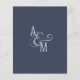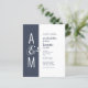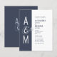 Budget wedding invitation. Modern simple geometric wedding design. Dark blue-ish gray and white. Bold and elegant typography. Bride’s and Groom’s monograms and a big ampersand as a symbol of unity.