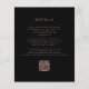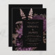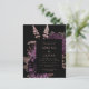 This elegant, moody wedding invitation features a lush, romantic floral bouquet in purple with rose gold faux foil and glitter foliage on a black background. Customize the rose pink text in stylish fonts on a black rectangle. The reverse side provides space for wedding details on a solid black background, along with a QR code guests can scan to visit your website and RSVP, which saves the cost of printing and mailing separate RSVP cards.