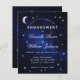 A budget engagement invitation for a celestial wedding theme, with the moon and star on a starry night blue background. The names are written in an elegant calligraphic script. The moon and the stars are faux silver foil, the text is white. On the black, there is only the moon and star on a starry night blue background.