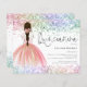 Multicolor Glitter Gown Quinceanera Invitation. A budget price SMALLER 4.5” x 5.6” alternative. Available in a SEMI GLOSS 110 lb CARD STOCK which is the default option (thicker for invitations), OR a SATIN FINISH 80 lb THINNER PAPER STOCK (ideal for enclosures). Envelopes are an optional extra and are slightly larger than the card size. Sparkly elegance for your Quinceanera with an illustration of the back view of a girl with plaited hair in a beautiful pink ball gown and rainbow colored glitter bordering the top and bottom on each side. The main header is in a set handwriting style script and easily personalise the rest of the text to your details.