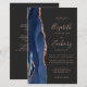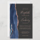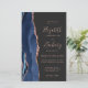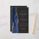 The left-hand edge of this elegant modern wedding invitation features a navy blue watercolor agate border trimmed with faux gold glitter. The customizable text combines gold-colored handwriting, copperplate and italic fonts on an off-black background. Add additional details on the back, along with a QR code to help your guests visit your wedding website.