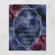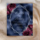 This elegant modern wedding invitation features a silver geometric frame decorated with burgundy and silver floral bouquets on a navy blue faux foil background. The customizable text combines silver gray whimsical handwriting, copperplate and italic fonts.