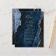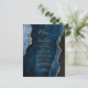 This elegant modern wedding menu features a navy blue watercolor agate border trimmed with faux gold glitter. The customizable text combines gold-colored handwriting script and copperplate fonts. The reverse side features a matching navy blue and gold agate design.