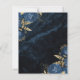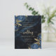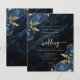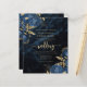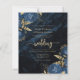 This elegant wedding invitation features blue floral bouquets set off with gold faux foil greenery in two corners, on a background image of navy blue watercolor agate. The customizable text combines gold-colored serif, italic and handwriting fonts. The reverse side features a matching navy blue and gold floral and agate design.