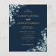 Modern wedding invitation. Featuring flourishes of rustic foliage and tiny blue flowers on a navy blue background with faux gold lettering. Easy to customize with your unique information.