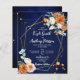 Orange and white roses sage eucalyptus greenery navy blue background gold geometrical frame floral budget wedding invitation template with QR RSVP code at the back.