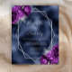This elegant modern wedding invitation features a silver geometric frame decorated with purple and silver floral bouquets on a navy blue faux foil background. The customizable text combines silver gray whimsical handwriting, copperplate and italic fonts.