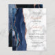 The left-hand edge of this elegant modern wedding invitation features a navy blue watercolor agate border trimmed with faux rose gold glitter. The customizable text combines dusty rose handwriting with black copperplate and italic fonts on a gray and white marble background. The reverse side features a matching navy blue and rose gold agate design.