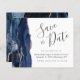 This elegant budget save the date card features a navy blue watercolor agate border trimmed with faux rose gold glitter. The customizable text combines charcoal gray handwriting script, copperplate and italic fonts on a white background. The reverse side features a matching navy blue and rose gold agate design.