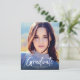 BUDGET Modern Brush Stroke Script Photo Graduation Announcement featuring your photo and our trendy script overlay in white The back is a modern navy blue, but all fonts and colors are easily modified. Stylish swirly text sets off your photo. Perfect for celebrating your graduate! Chic and darling. **Our BUDGET paper is smaller and more delicate, but still beautiful!** If you need assistance or matching items, please contact us at cedarandstring@gmail.com.