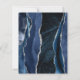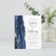 The left-hand edge of this elegant modern wedding invitation features a navy blue watercolor agate border trimmed with faux silver glitter. The customizable text combines charcoal gray calligraphy script and sans serif font on a white background. The reverse side features a matching navy blue and silver agate design.