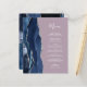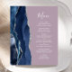 The left-hand edge of this elegant modern wedding menu features a navy blue watercolor agate border trimmed with faux silver glitter. The customizable text combines white handwriting script and copperplate fonts on a mauve purple background. The reverse side features a matching navy blue and silver agate design.