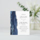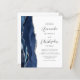 The left-hand edge of this elegant modern wedding invitation features a navy blue watercolor agate border trimmed with faux silver glitter. The customizable text combines charcoal gray script and sans serif fonts on a white background. The reverse side provides space for wedding details on a solid white background, along with a QR code guests can scan to visit your website and RSVP, which saves the cost of printing and mailing separate RSVP cards.