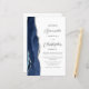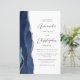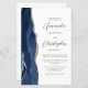 The left-hand edge of this elegant modern wedding invitation features a navy blue watercolor agate border trimmed with faux silver glitter. The customizable text combines charcoal gray script and sans serif fonts on a white background. The reverse side provides space for wedding details on a solid white background, along with a QR code guests can scan to visit your website and RSVP, which saves the cost of printing and mailing separate RSVP cards.