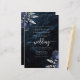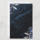 This elegant wedding invitation features navy blue floral bouquets set off with silver faux foil greenery in two corners, on a background image of navy blue watercolor agate. The customizable silver gray text combines serif, italic and handwriting fonts. The reverse side features a matching navy blue and silver floral and agate design.