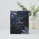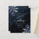 This elegant wedding invitation features navy blue floral bouquets set off with silver faux foil greenery in two corners, on a background image of navy blue watercolor agate. The customizable silver gray text combines serif, italic and handwriting fonts. The reverse side features a matching navy blue and silver floral and agate design.