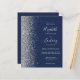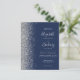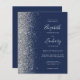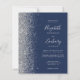 The left-hand edge of this elegant modern wedding invitation features a silver faux glitter border. The customizable text combines silver gray handwriting, copperplate and italic fonts on a navy blue background. Add additional details on the back, along with a QR code to help your guests visit your wedding website.