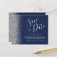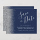 This elegant budget save the date card features a silver faux glitter border. The customizable text combines silver gray handwriting script, copperplate and italic fonts on a navy blue background. The reverse side features a matching navy blue and silver design.