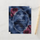 This elegant modern wedding invitation features a silver geometric frame decorated with burgundy and silver floral bouquets on a navy blue faux foil background. The customizable text combines silver gray whimsical handwriting, copperplate and italic fonts. Add additional details on the back, along with a QR code to help your guests visit your wedding website.
