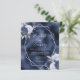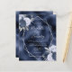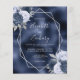 This elegant modern wedding invitation features a silver geometric frame decorated with dusty blue, navy blue and silver floral bouquets on a navy blue faux foil background. The customizable text combines silver gray whimsical handwriting, copperplate and italic fonts. NOTE: Envelopes are not automatically included with these budget invitations, so please remember to choose the "blank white envelopes" option!