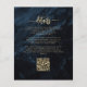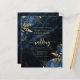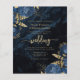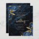 This elegant wedding invitation features navy blue floral bouquets set off with gold faux foil greenery in two corners, on a background image of navy blue watercolor agate. The customizable text combines gold-colored serif, italic and handwriting fonts. The reverse side provides space for wedding details, along with a QR code guests can scan to visit your website and RSVP, which saves the cost of printing and mailing separate RSVP cards.