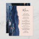 The left-hand edge of this elegant modern wedding menu features a navy blue watercolor agate border trimmed with faux rose gold glitter. The customizable text combines handwriting script and copperplate fonts in charcoal gray on a blush pink background. The reverse side features a matching navy blue and rose gold agate design.