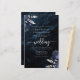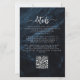 This elegant wedding invitation features navy blue floral bouquets set off with silver faux foil greenery in two corners, on a background image of navy blue watercolor agate. The customizable silver gray text combines serif, italic and handwriting fonts. The reverse side provides space for wedding details, along with a QR code guests can scan to visit your website and RSVP.