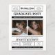 This graduation invitation features a newspaper-inspired design with a structured, vintage aesthetic. It includes a bold headline at the top, styled like a newspaper banner, followed by a large announcement of the occasion in serif typeface. Two side-by-side photos of the graduate are framed neatly in the center. Below, the event details, such as the date, time, location, and RSVP, are displayed in a clean, bordered section. A bold footer at the bottom highlights the School name and graduate's class, tying the design together with a monochromatic black-and-white color scheme for a formal and elegant look.