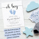 Cute budget-friendly minimal baby boy shower invitation with "oh boy" in a stylish script with swashes and a pastel blue watercolor of baby feet. Underneath you can easily personalize the shower details. This budget semi-gloss paper is similar in weight to photo paper. A larger 5x7 traditional card stock version is also available (message us for the link).