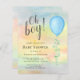 This budget boy's Baby Shower Invitation is decorated with a watercolor blue balloon and green eucalyptus on a colorful sky background and says "Oh Boy!"