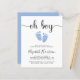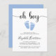 Cute budget-friendly drive by baby boy shower invitation with "oh boy" in a stylish script with swashes and a pastel blue watercolor of baby feet. Underneath you can easily personalize the shower details.