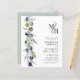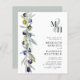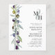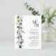 Budget Olive Branch Symbol of Love Monogram Wedding Invitation with QR Code RSVP on Back... The front of our affordable botanical monogram wedding invitation features the bride's and groom's initials overlaid on a pastel ampersand above personalized invitation text in black serif and sans serif typography on a white background. Bordering the invitation text on the left is a beautiful watercolor olive branch in shades of dusty green, dark blue, and purple. The light dusty green back of the invitation includes your wedding website QR code as well as the website's URL allowing your invitees to easily RSVP online and view all of the details normally sent in a wedding packet. The example QR code and all example text (aside from the ampersand and calligraphy elements) can be easily revised with your own information on the personalization template.