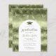 This design features a geometric faux metal background pattern in olive green and silver. The text appears in olive green script and charcoal gray italics on a white arch shape, with the word "graduation" and the graduate's name in decorative script, along with an olive green cap topper. The back repeats the olive green geometric pattern.