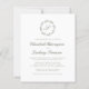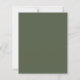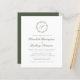 This elegant wedding invitation design features an olive green script monogram initial encircled by a line art botanical wreath. The names appear in olive green script, with the rest of the text in classic serif font. The back of the card is solid olive green.