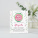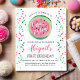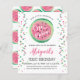 This cute first birthday invitation features a cross-section of a watermelon in pink and green watercolor, with the words "One in a Melon!" in white script. Personalize it with the birthday girl's name in pink script and the remaining text in off-black. A border of pink and green confetti decorates the left and right edges, and the reverse side features a matching pink and green watercolor melon pattern. Ideal for a little girl's summer birthday party!