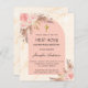 An arch frame and rose gold marble print as background. Decorated with rose gold and pink florals, roses and pampas grass. Personalize and add a name and details.