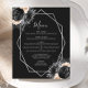 This elegant modern wedding menu features a silver geometric frame decorated with peach, black and silver floral bouquets on a black background. The customizable text combines silver gray whimsical handwriting, copperplate and italic fonts. The reverse side is solid black.