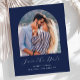 This simple, minimalist Save the Date card features a boho photo arch above the words "Save the Date" in elegant white handwriting script, followed by the couple's names, wedding date and city in sans serif font on a navy blue background. Add a more detailed message with additional information on the reverse.